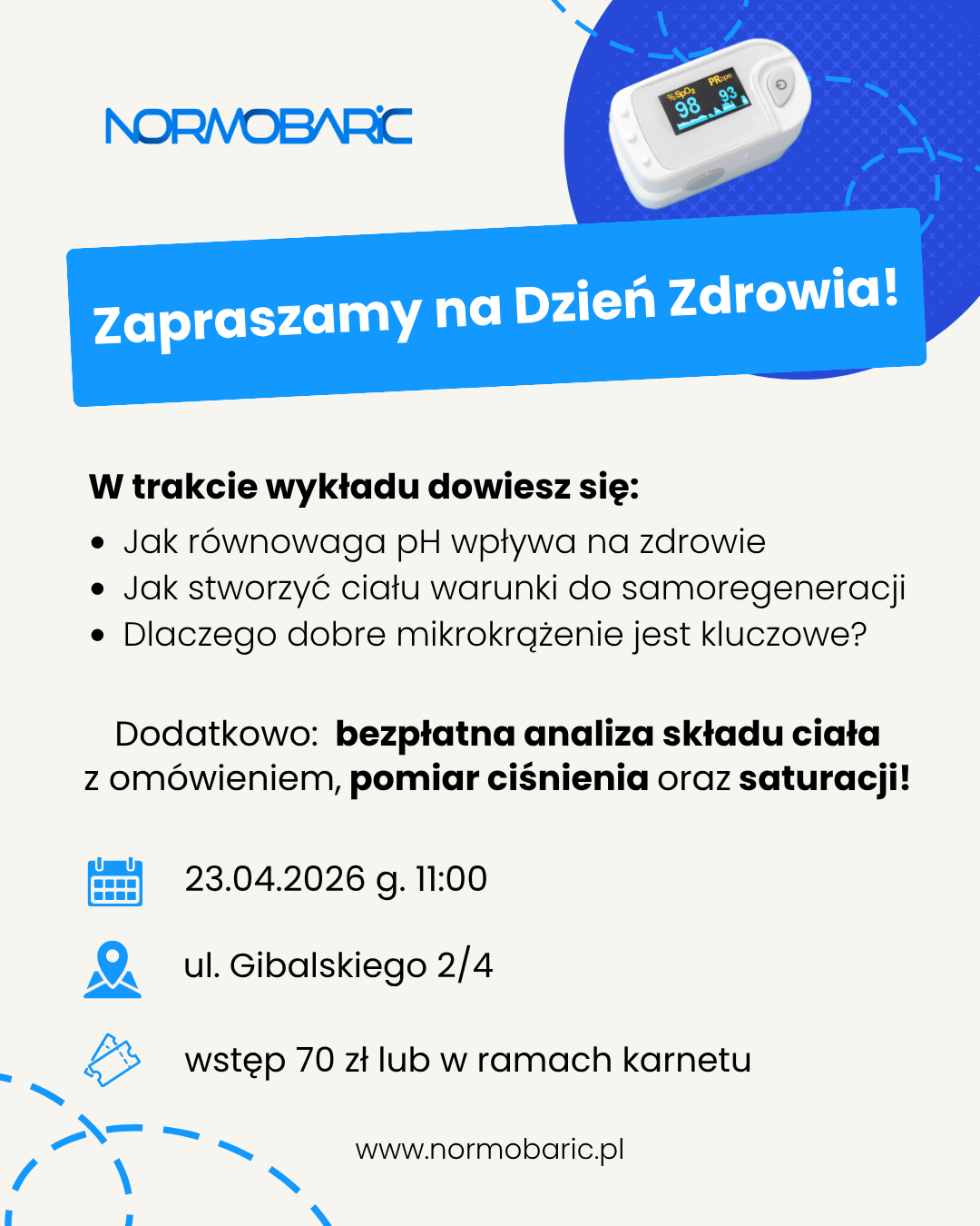 Zapraszamy na kolejny Dzień Zdrowia w naszej komorze normobarycznej w Łodzi. To spotkanie dla wszystkich osób, które chcą lepiej zrozumieć, jak działa organizm i co możemy zrobić, aby wspierać jego naturalną regenerację.